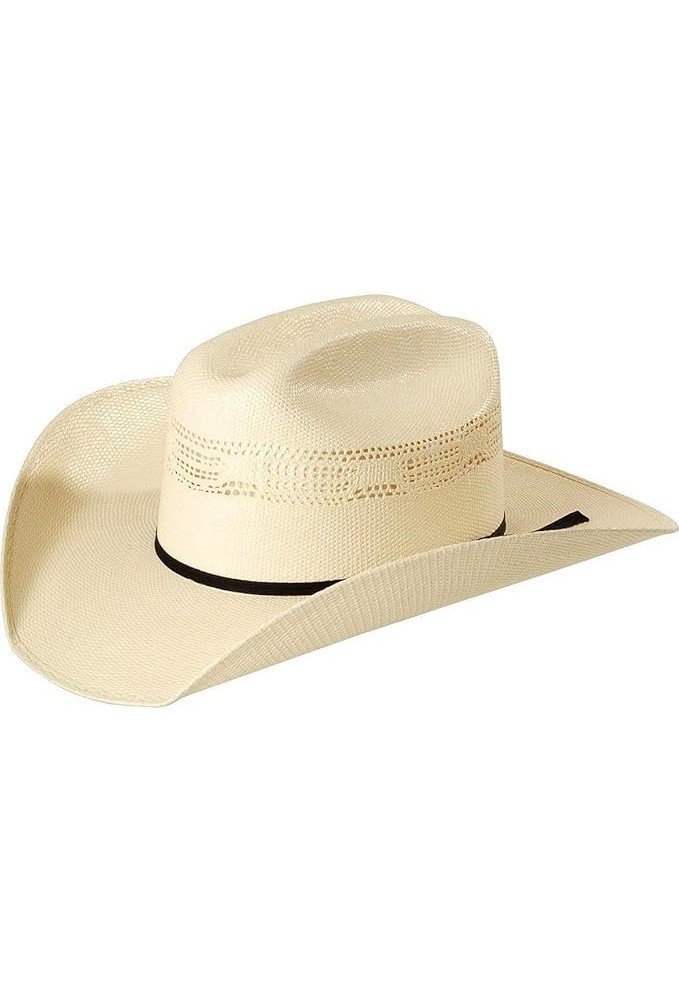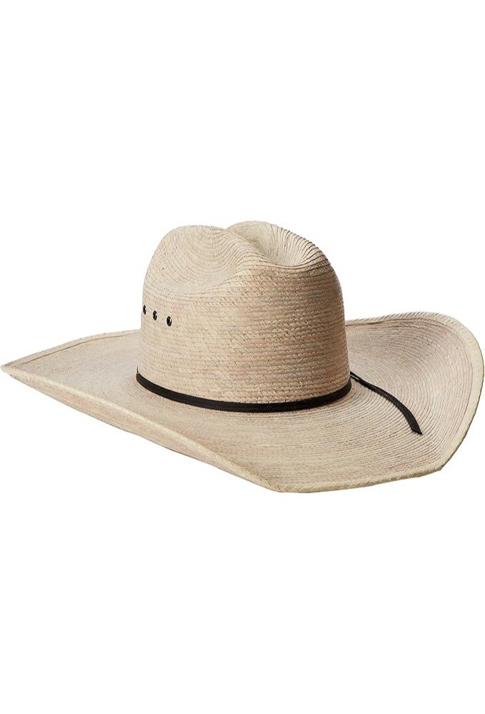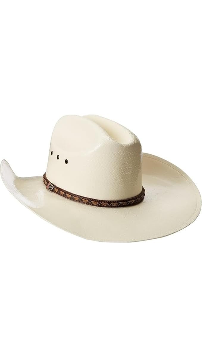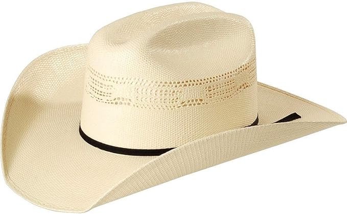 The hat is made from straw fabric, features a drawstring closure, a Western fit, and is machine washable for easy care.